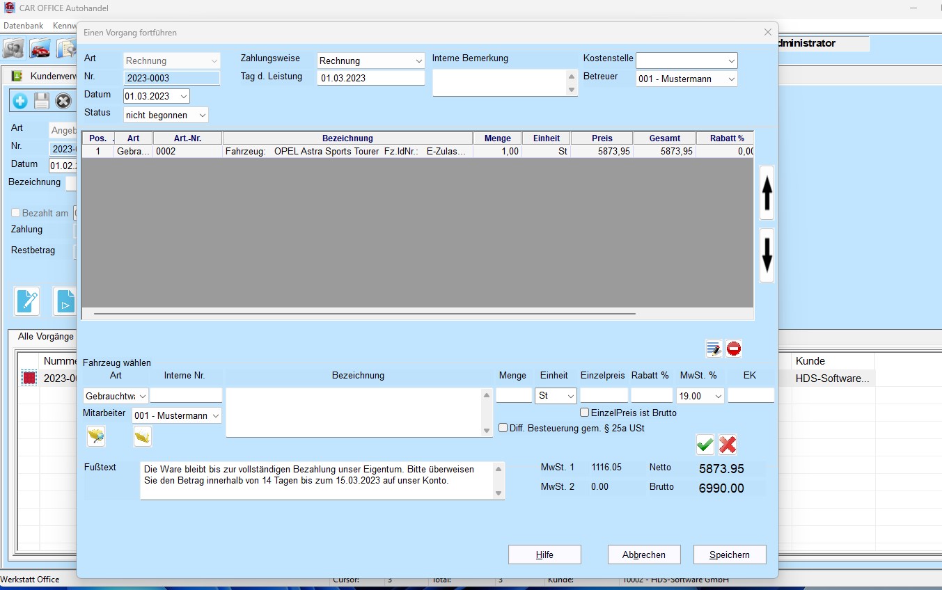 Sie können mit CAR OFFICE Autohandel Angebote, Kostenvoranschläge, Auftragsbestätigung, Rechnungen und Korrekturbelege erstellen und verwalten.